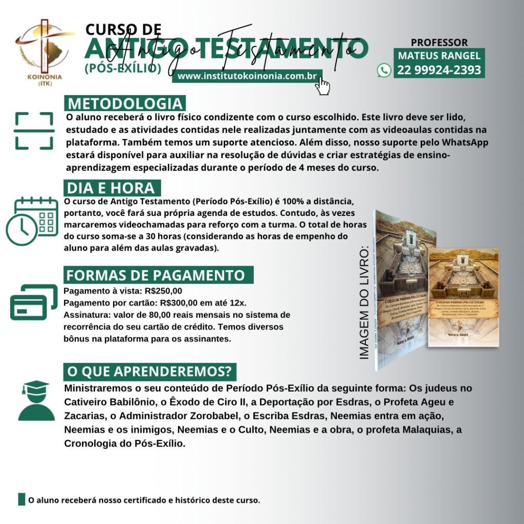 Casado, pai e fundador/diretor do Instituto Teológico Koinonia, Mateus G. Rangel também é linguista e literato pela UFF, psicopedagogo institucional e bacharel em Teologia pela FATIN. Com expertise em Hebraico Bíblico, Grego Koiné, cultura judaico-cristã e greco-romana e hermenêutica midrashita, leciona desde 2016 e já formou mais de 4.000 alunos no Brasil e no exterior.
